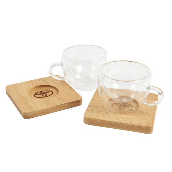 Set of 2 trendy double wall espresso glasses with capacity of 90ml and with bamboo saucers with the logo engraved. Presented in Kraft paper box.