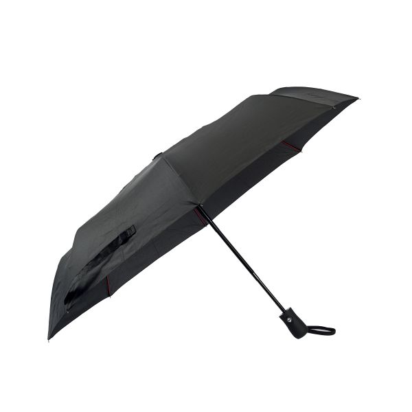 3 folding black umbrella in pongee material and rubber coated plastic handle with automatic opening and closure system. Nice detail with the red inside ribs. White logo printed on the pouch.
