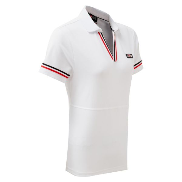 A great sporty white poloshirt with matching knitted collar featuring red white and black stripes to the v-neck and sleeve cuffs.