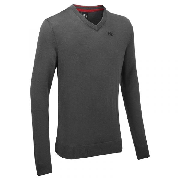 Our smart signature knitted V-neck sweater is perfect for days on the road. The dark grey jumper features a subtle embroidered TOYOTA logo to the front and back along with contrasting red knitted detailing to the inside of the cuffs and neck.