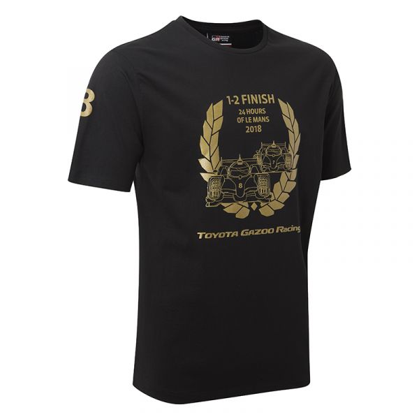 A classic fit black crew neck t-shirt featuring in gold the TOYOTA HYBRID TS050 No.8 and No.7 Le Mans podium winning cars driving through the winning laurels.