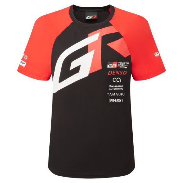 Show your unwavering support for the TOYOTA GAZOO Racing rally team with this stylish and feminine women's t-shirt. The distinctive GR print is displayed prominently on both sides, declaring your passion for motorsport. The flattering fitted waist and elegant lower neckline accentuate your silhouette, while the bold red shoulders and raglan sleeves add a touch of athletic flair. Featuring the official 2025 team and sponsor logos, you will feel like a true member of the team.