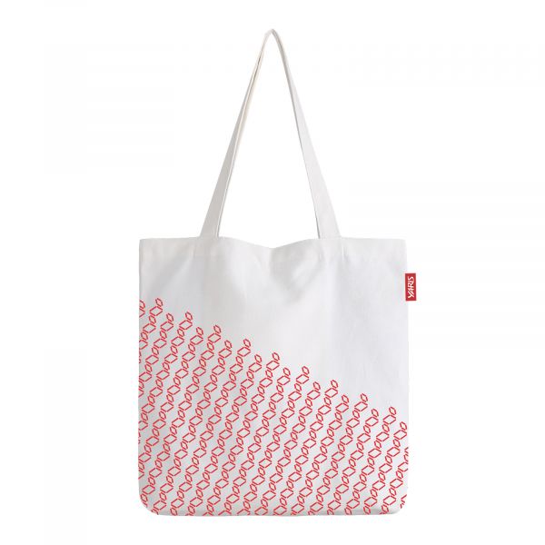 White cotton bag with red Toyota Yaris design on both sides and red logo label on the side.