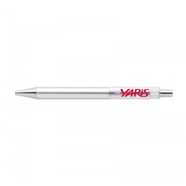 Stylish silver pen with Toyota Yaris logo in red on the clip. Blue writing color.